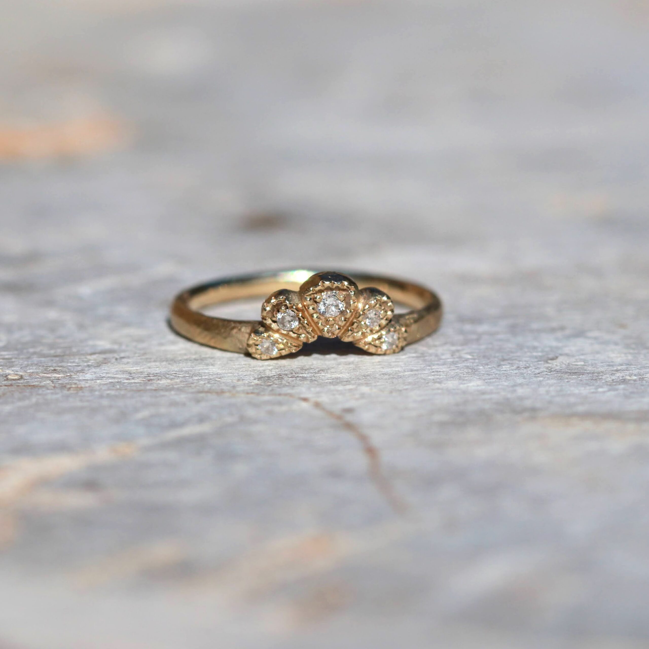 טבעת זהב 14K במשקל 2.5 גרם, משובצת חמישה יהלומים לבנים טבעיים במשקל כולל של 0.07 קראט.