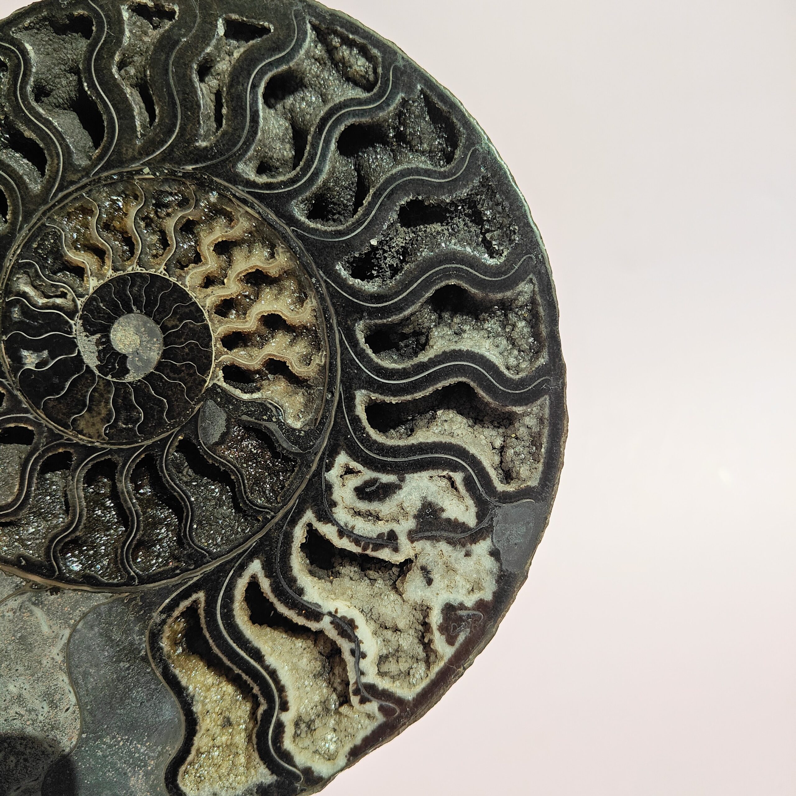 הצבע השחור העמוק שמאפיין אמונייט זה נוצר בתהליך התאבנות ממושך, שבו חדרו לתוך קליפת המאובן חומרים אורגניים כמו ביטומין (Bitumen) ופחמן טבעי. אלו חומרים שמקורם בפירוק אורגני בתנאי לחץ ועומק, והם אלו שהעניקו לאמונייט את גונו הדרמטי והעוצמתי. לעיתים, תהליך זה התרחש גם בסביבה עשירה במינרלים מתכתיים כמו פיריט, שתורמים לנגיעות מבריקות או גוון מתכתי קל.