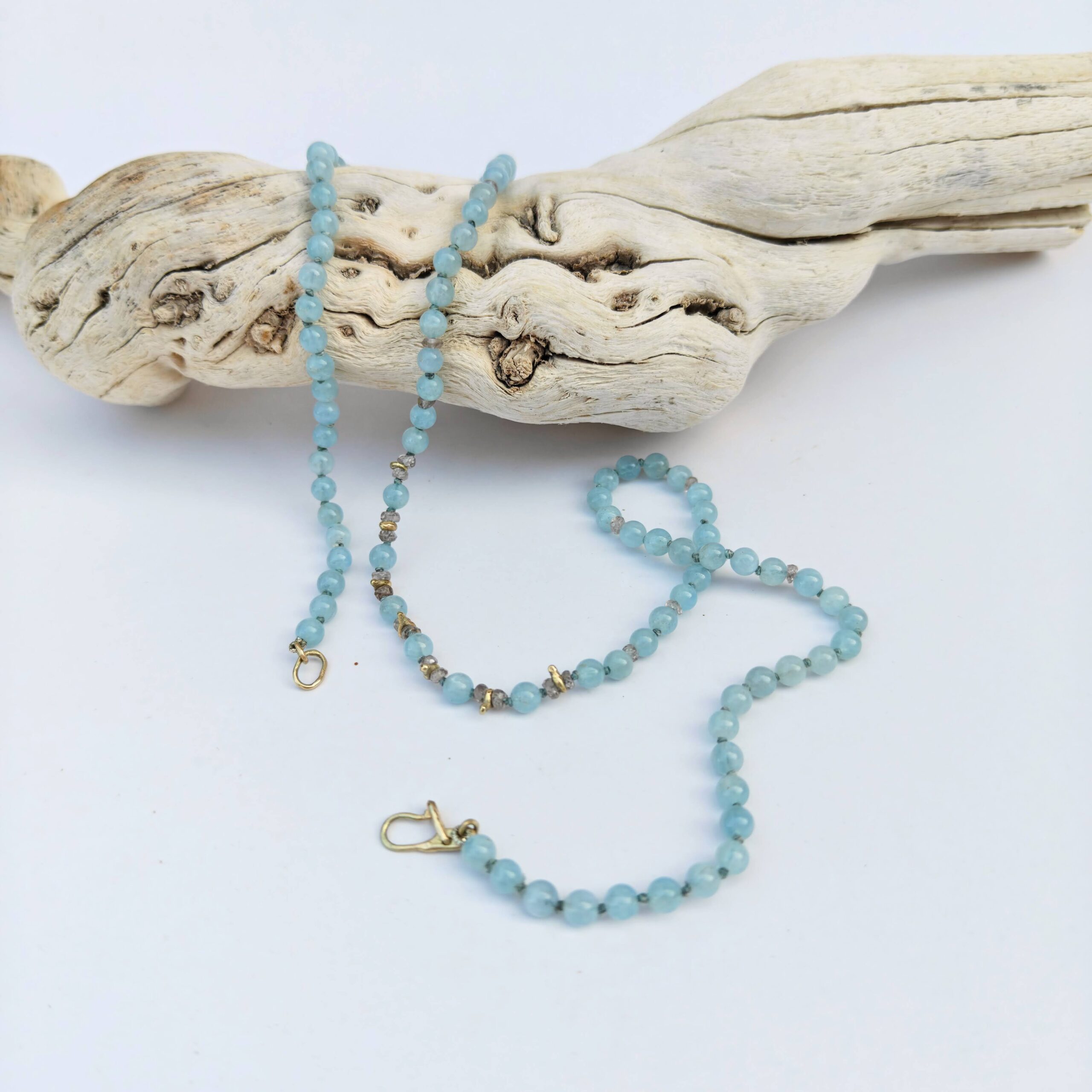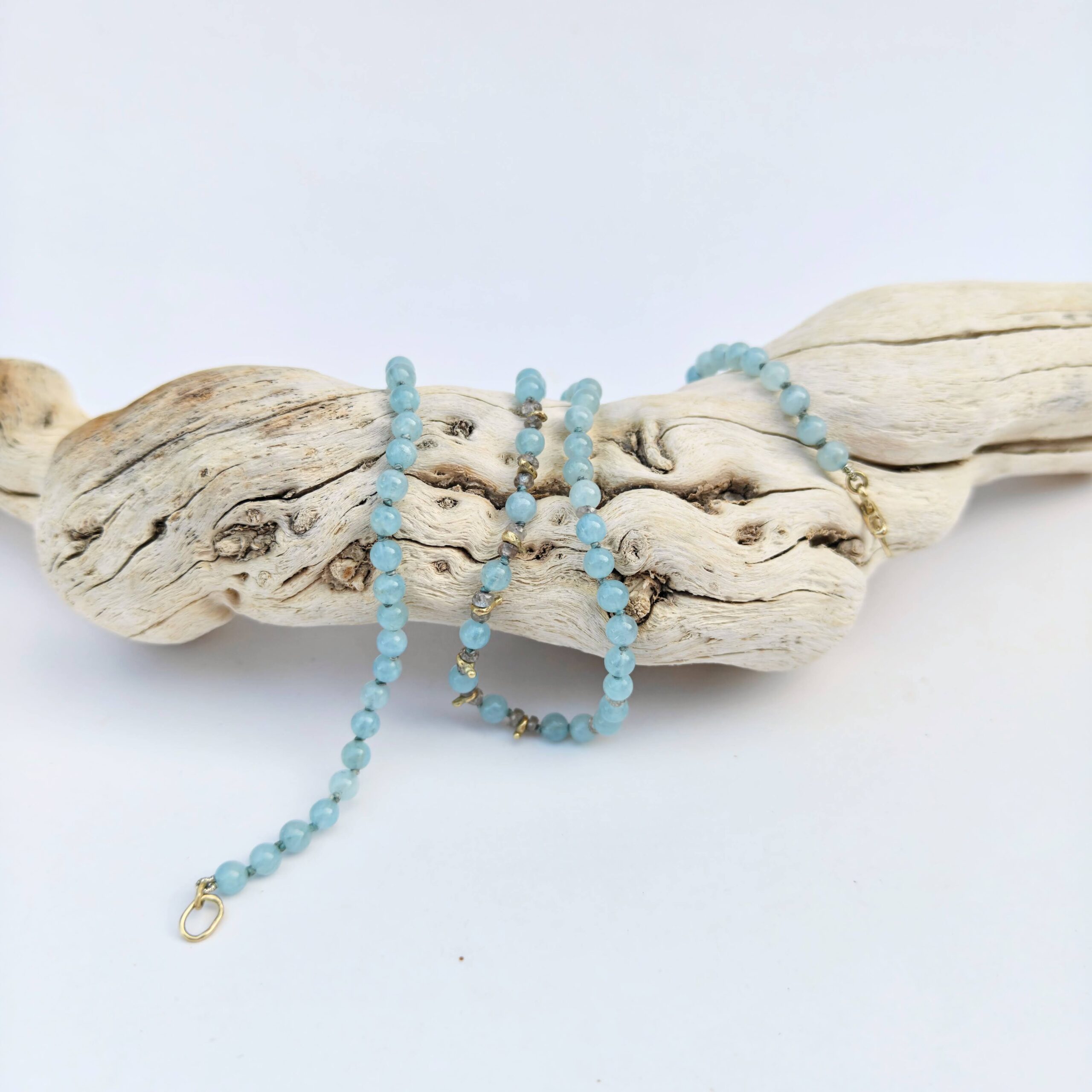 שרשרת חרוזים המשלבת אקוומרין טבעי בגוון תכלת רך וצלול.
