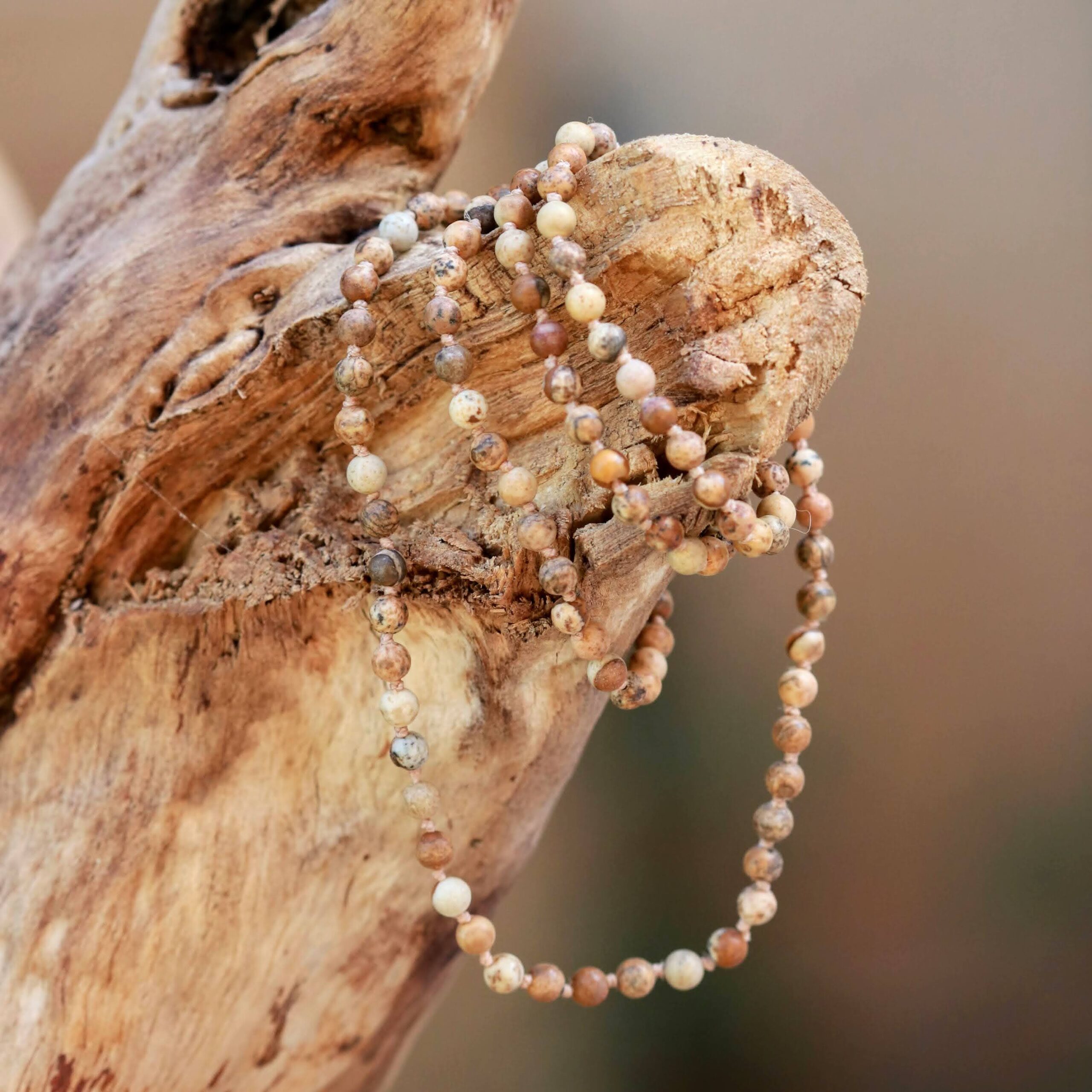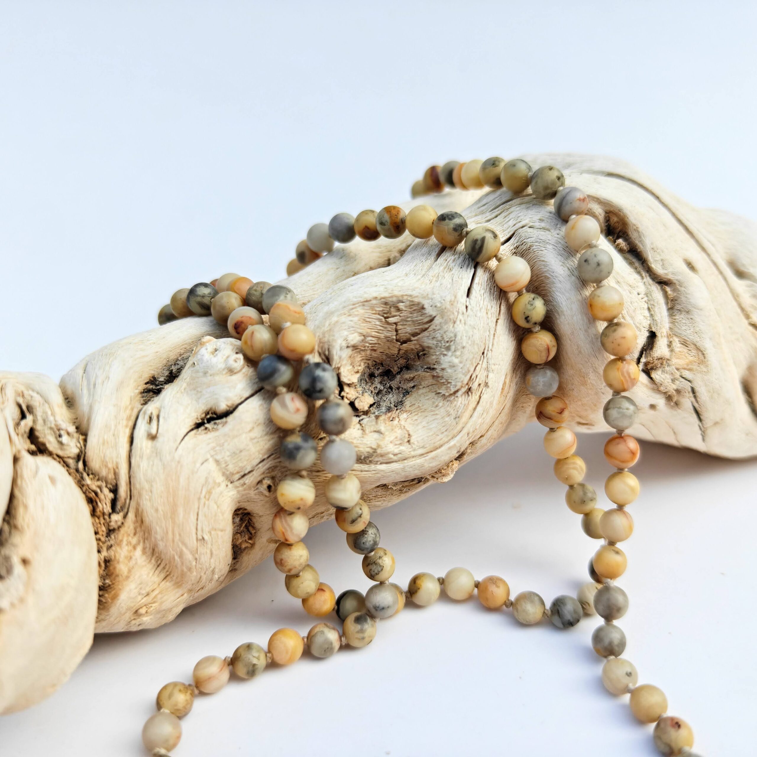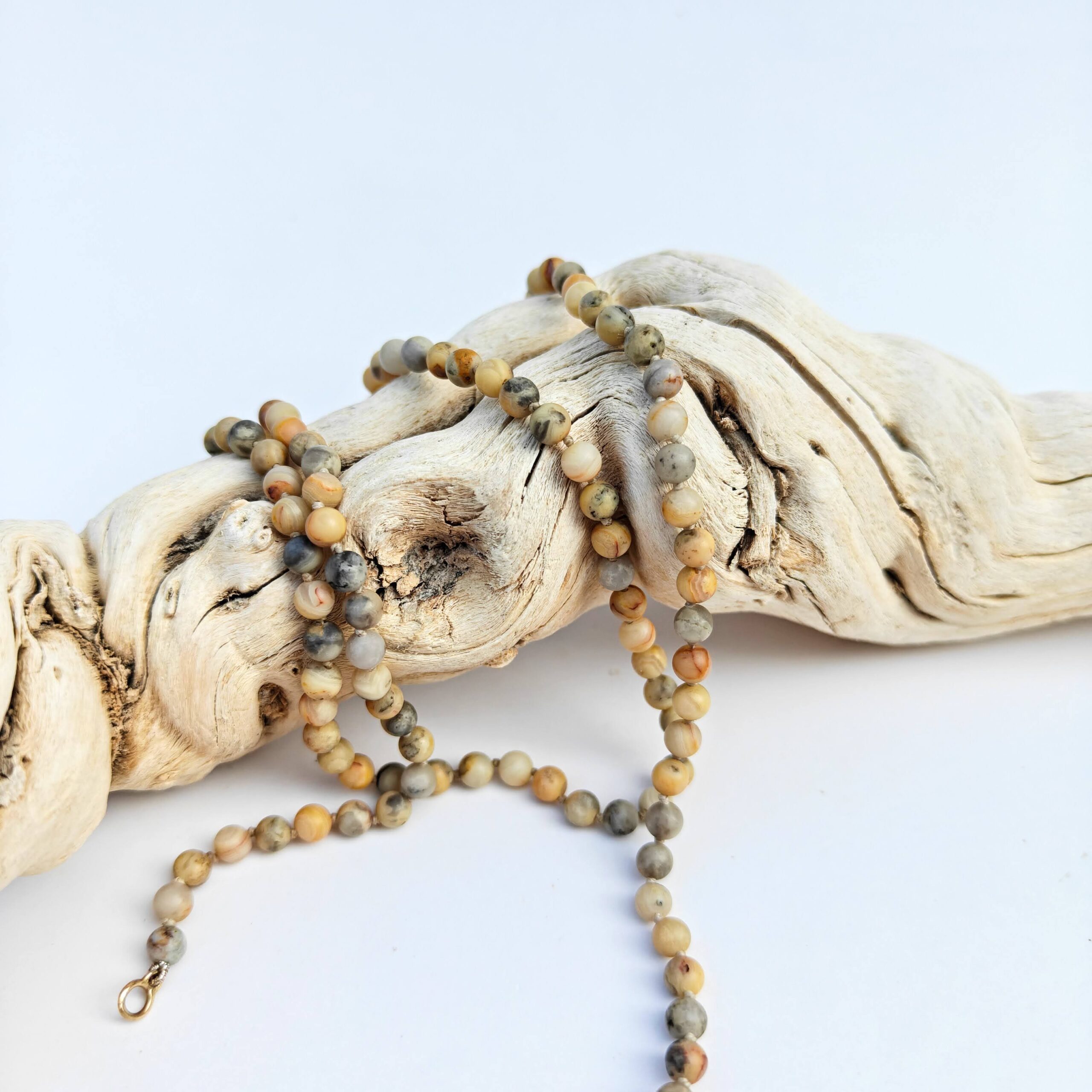 בין כל חרוז נקשר קשר ביטחון המדגיש את היופי הטבעי של האבנים ושומר על מבנה השרשרת.