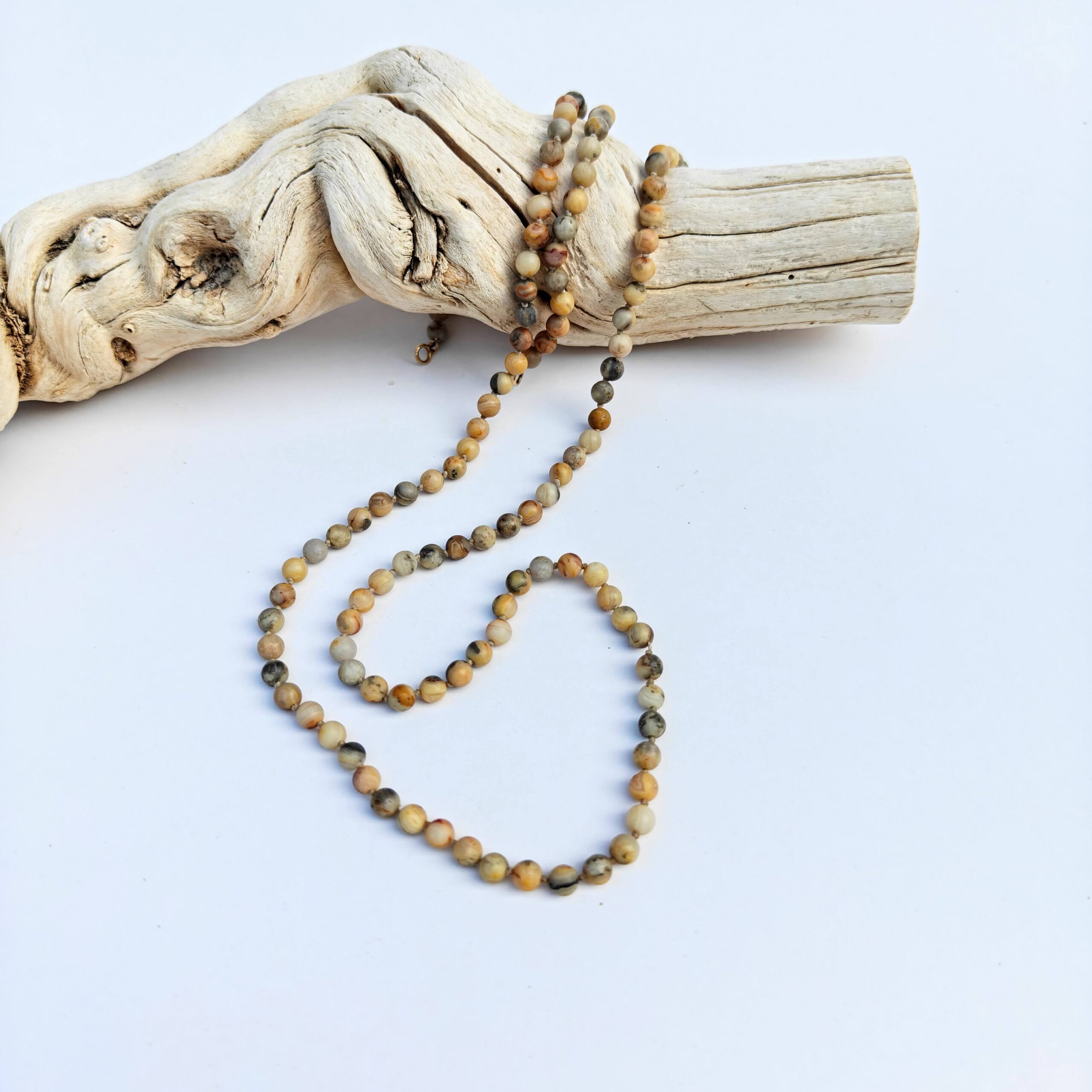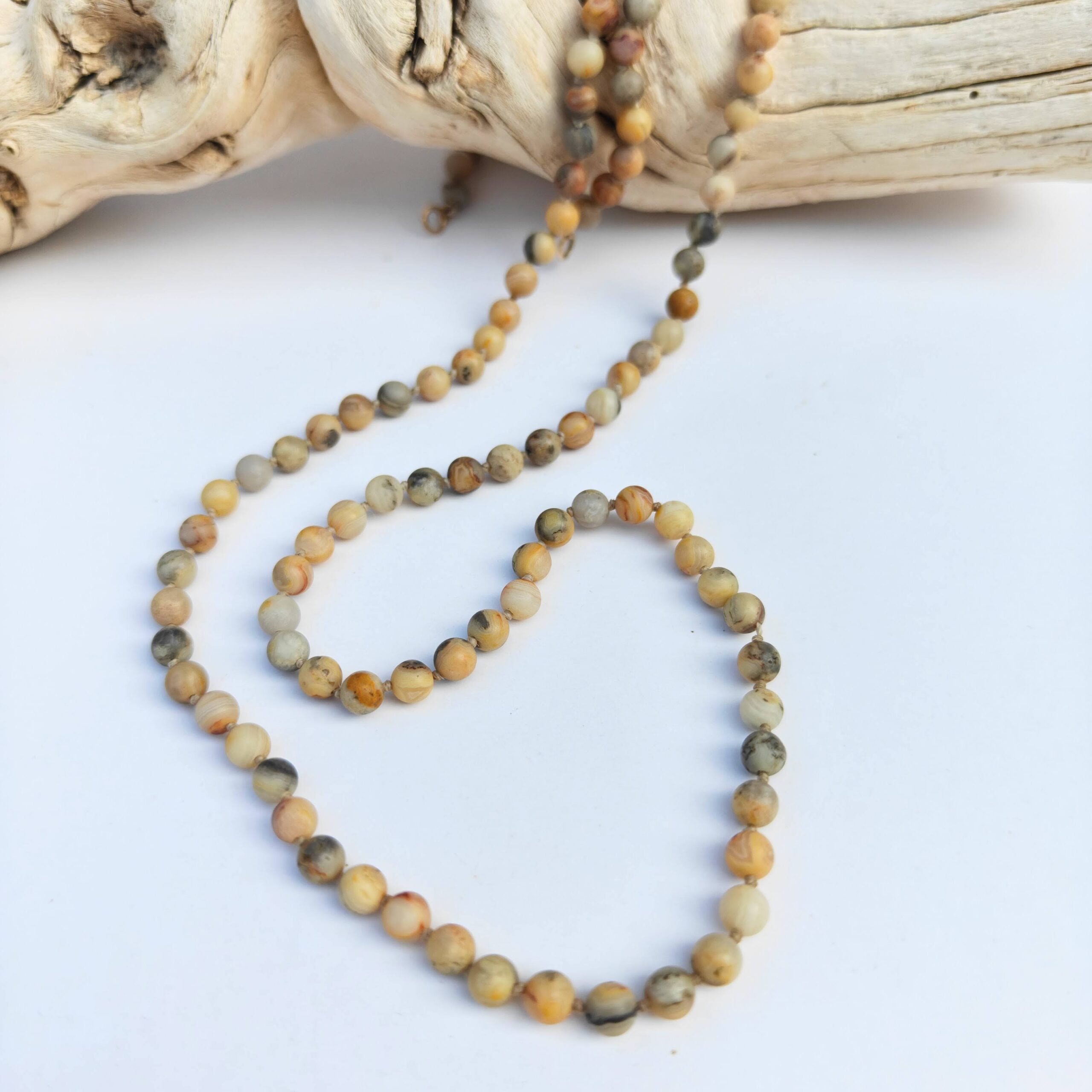 שרשרת חרוזים המשלבת קרייזי לייס אגת בגוונים טבעיים ודוגמאות ייחודיות לכל אבן.