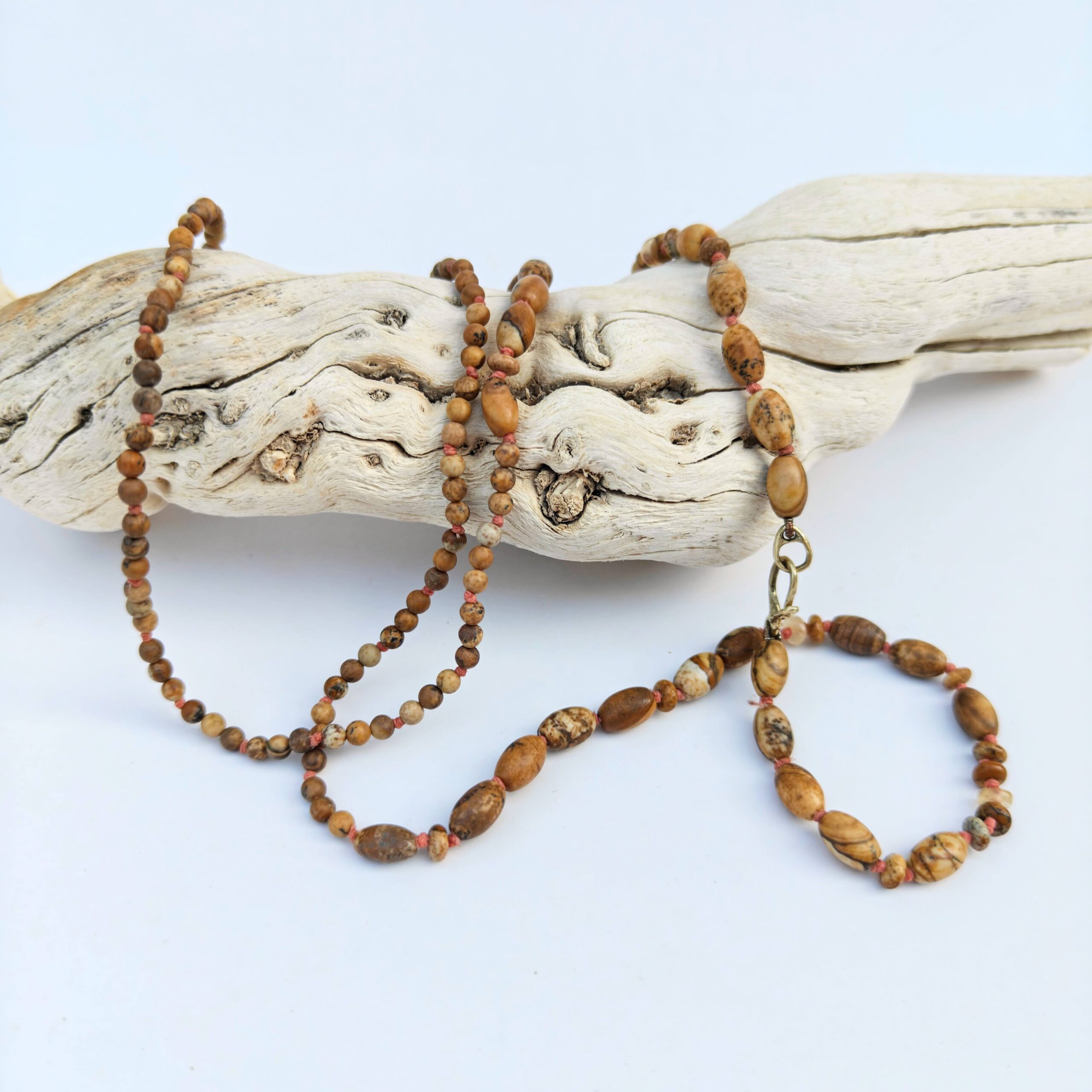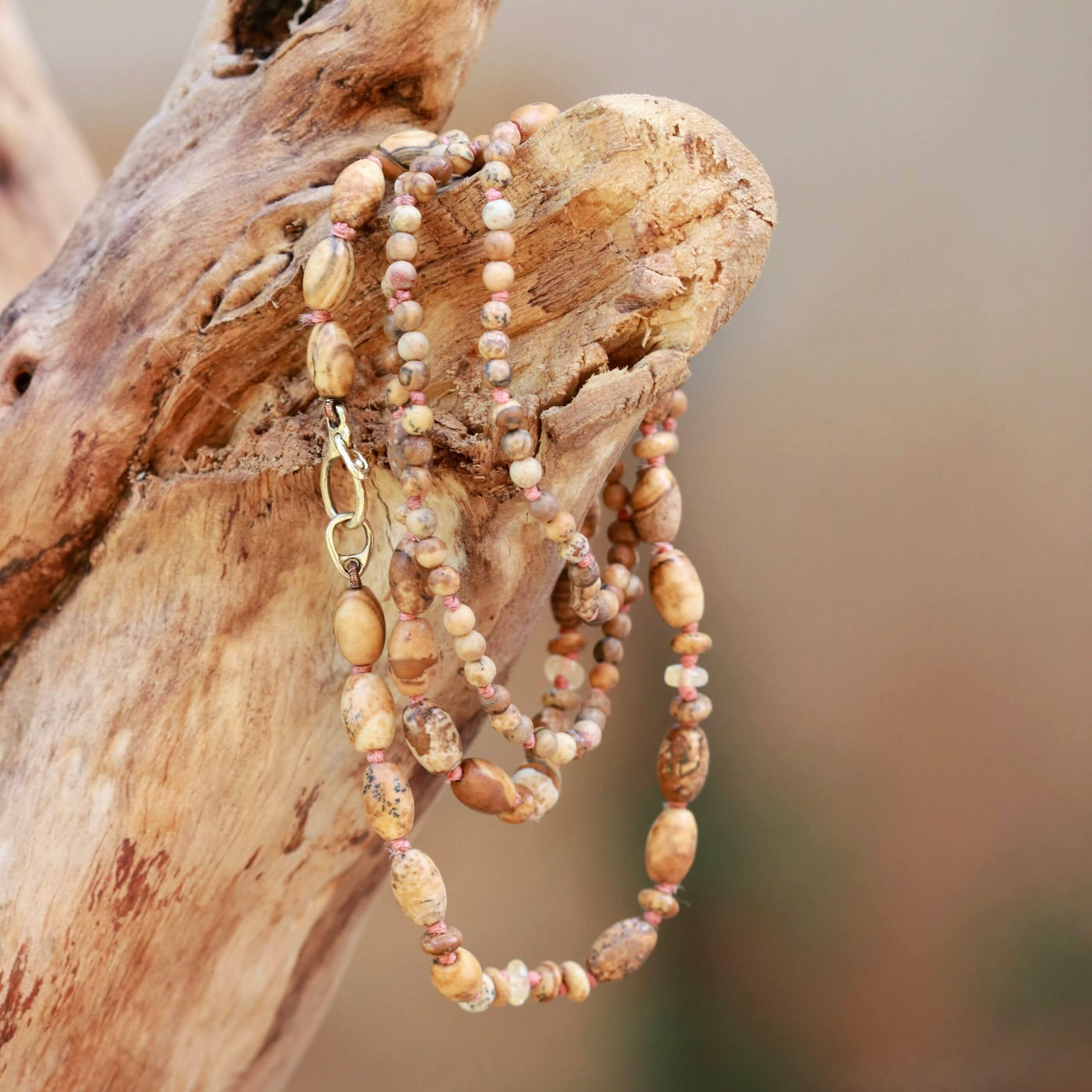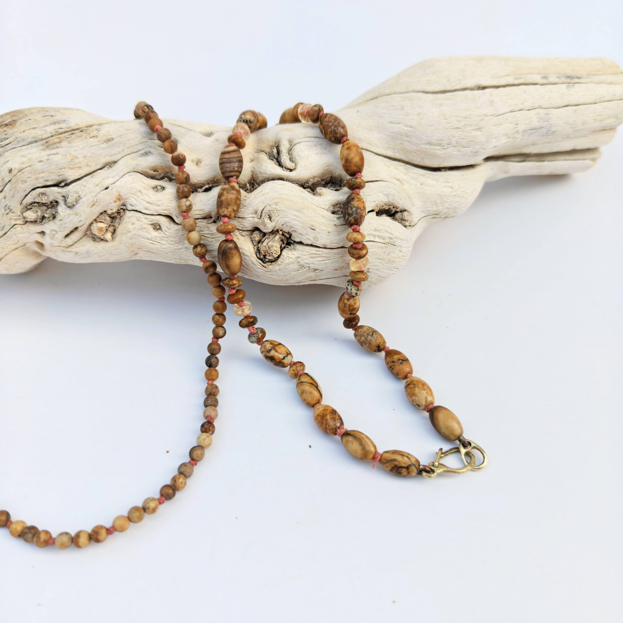 שרשרת חרוזים המשלבת ג'ספר פיקצ'ר טבעי בצורות שונות לצד חרוזי סיטרין בגוונים רכים.