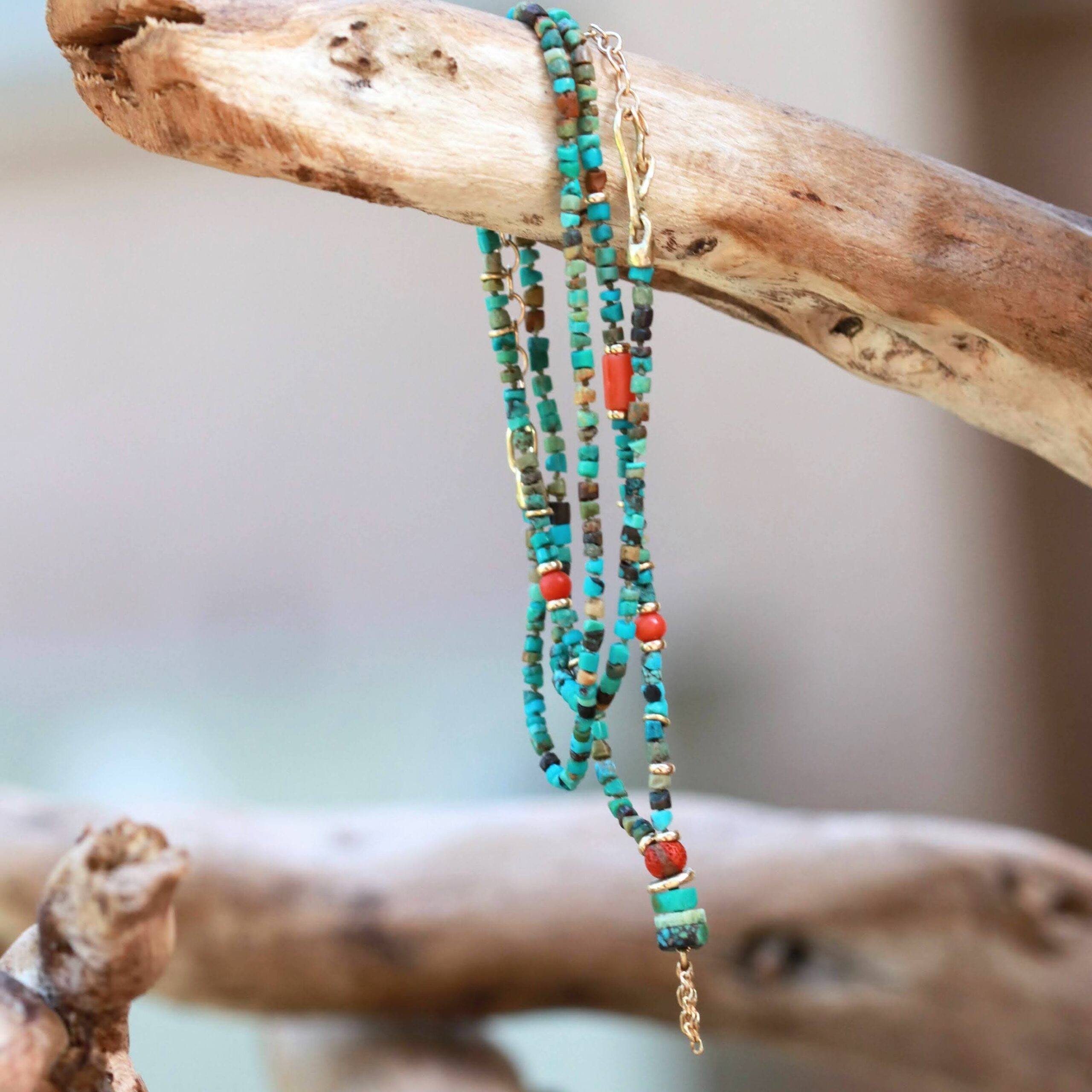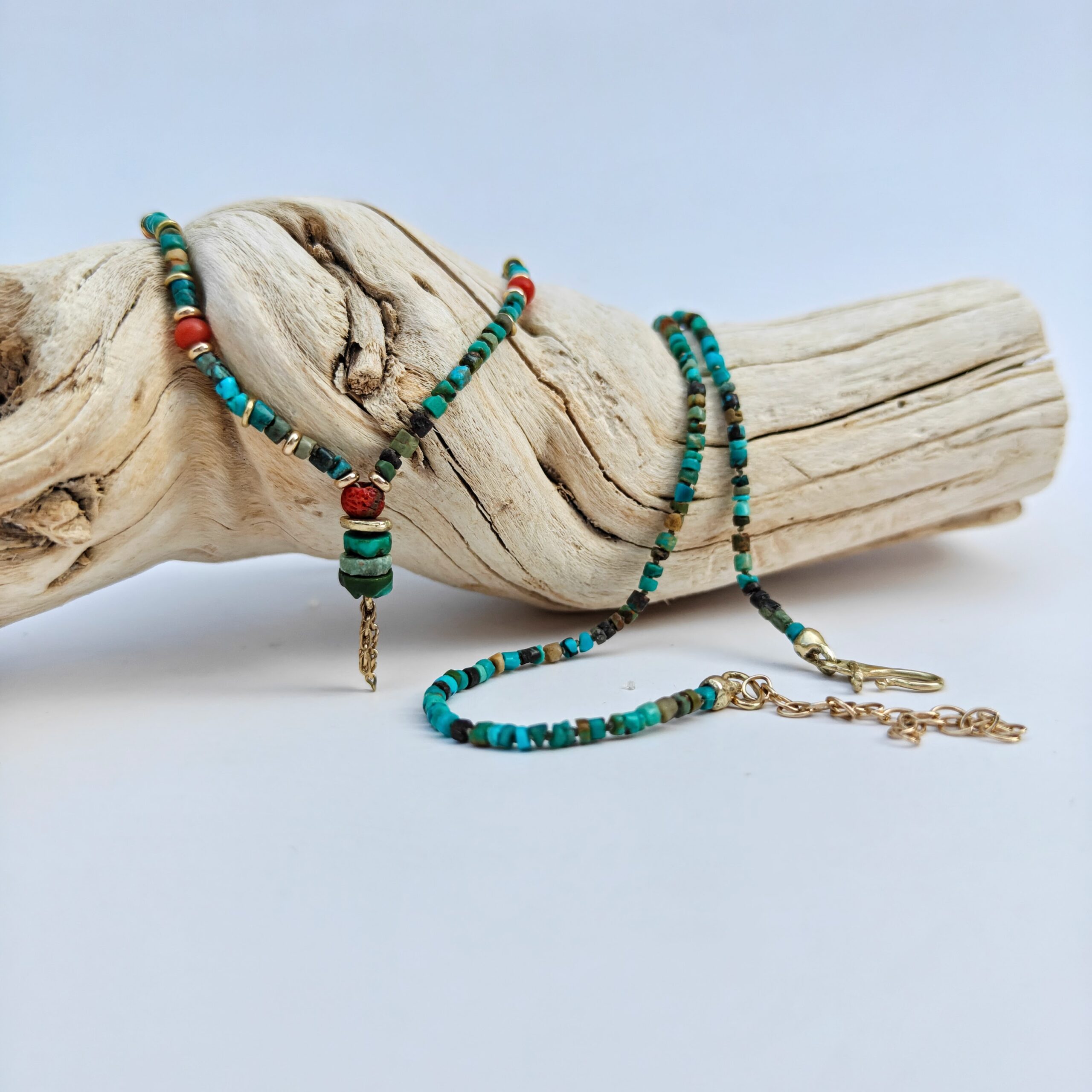 שרשרת חרוזים בעבודת יד המשלבת טורקיז וקורל טבעיים בגוונים חיים ועשירים.