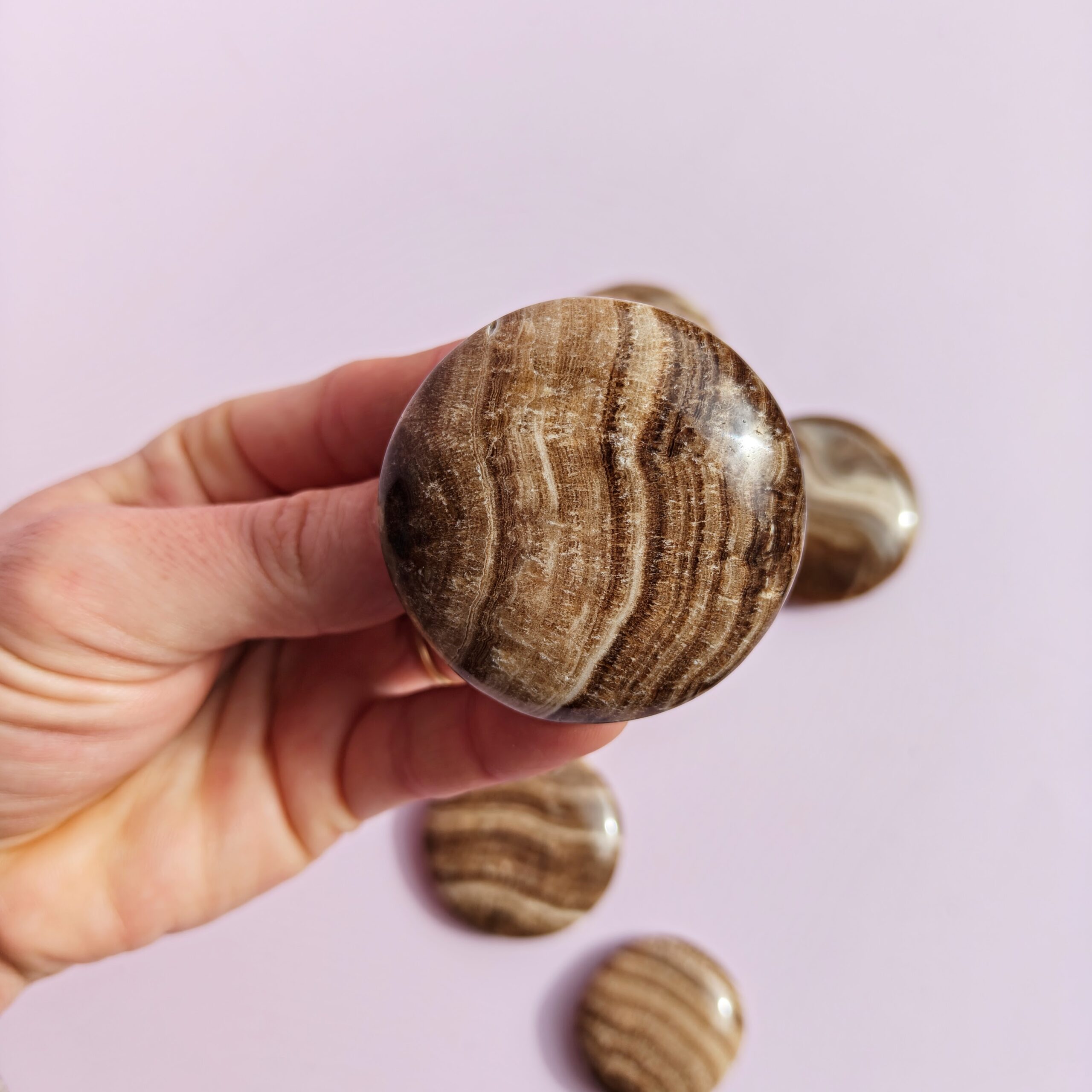 קלציט שוקולד נושאת תדר חם ומייצב, כזה שמחזיר אותנו לגוף ולקרקע בלי להכביד. הפסים הטבעיים שלה נראים כמו שכבות שנבנו לאורך זמן, ומספרים סיפור של התבססות שקטה: לא בבת אחת, אלא לאט, יציב, מבפנים.