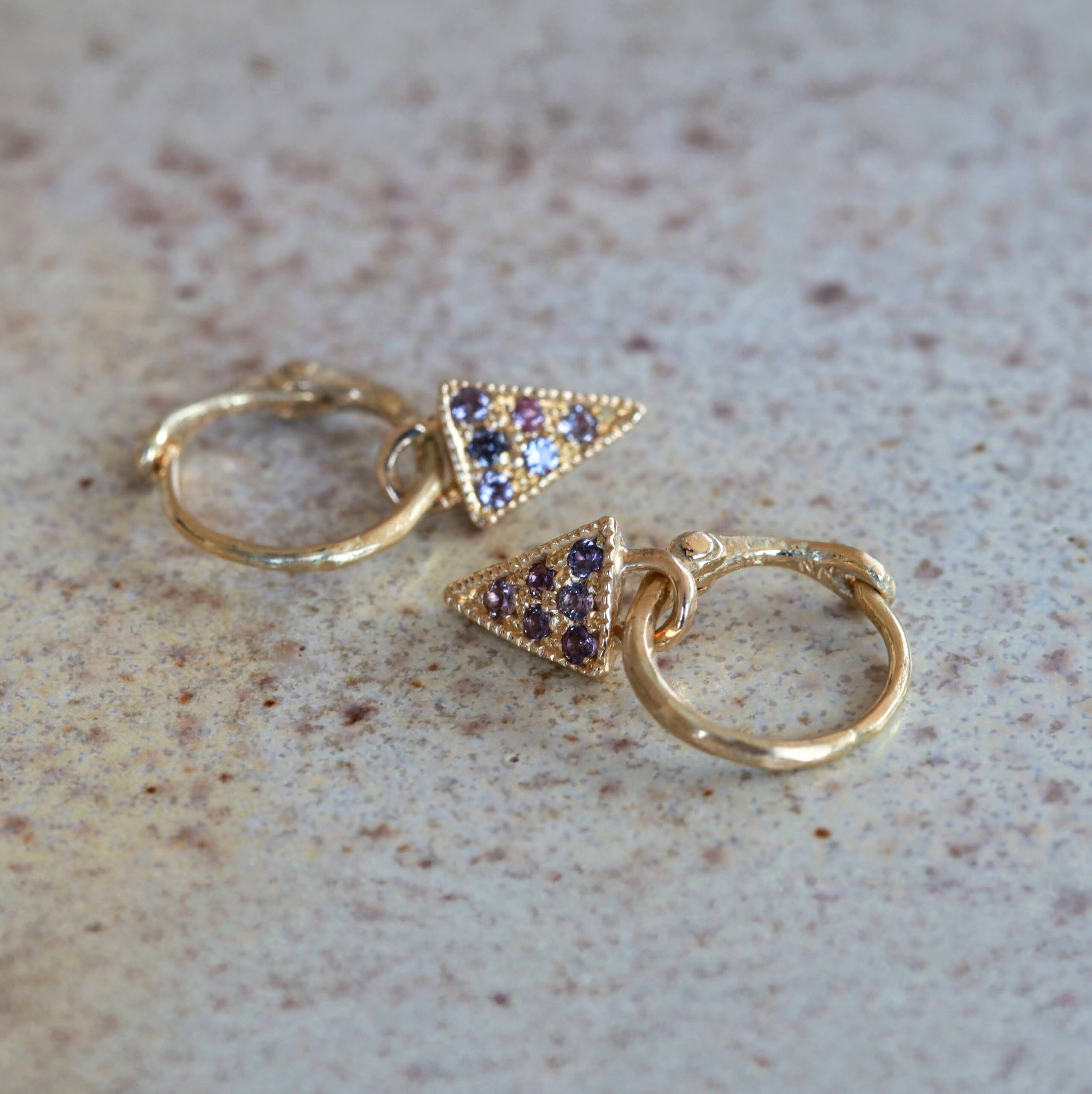 מהחישוקים משתלבים תליונים משולשים מוארכים המשובצים 6 ספירים סגולים קטנים בשיבוץ גולגולים עדין, היוצרים משחק אור עשיר ונגיעה צבעונית אלגנטית.