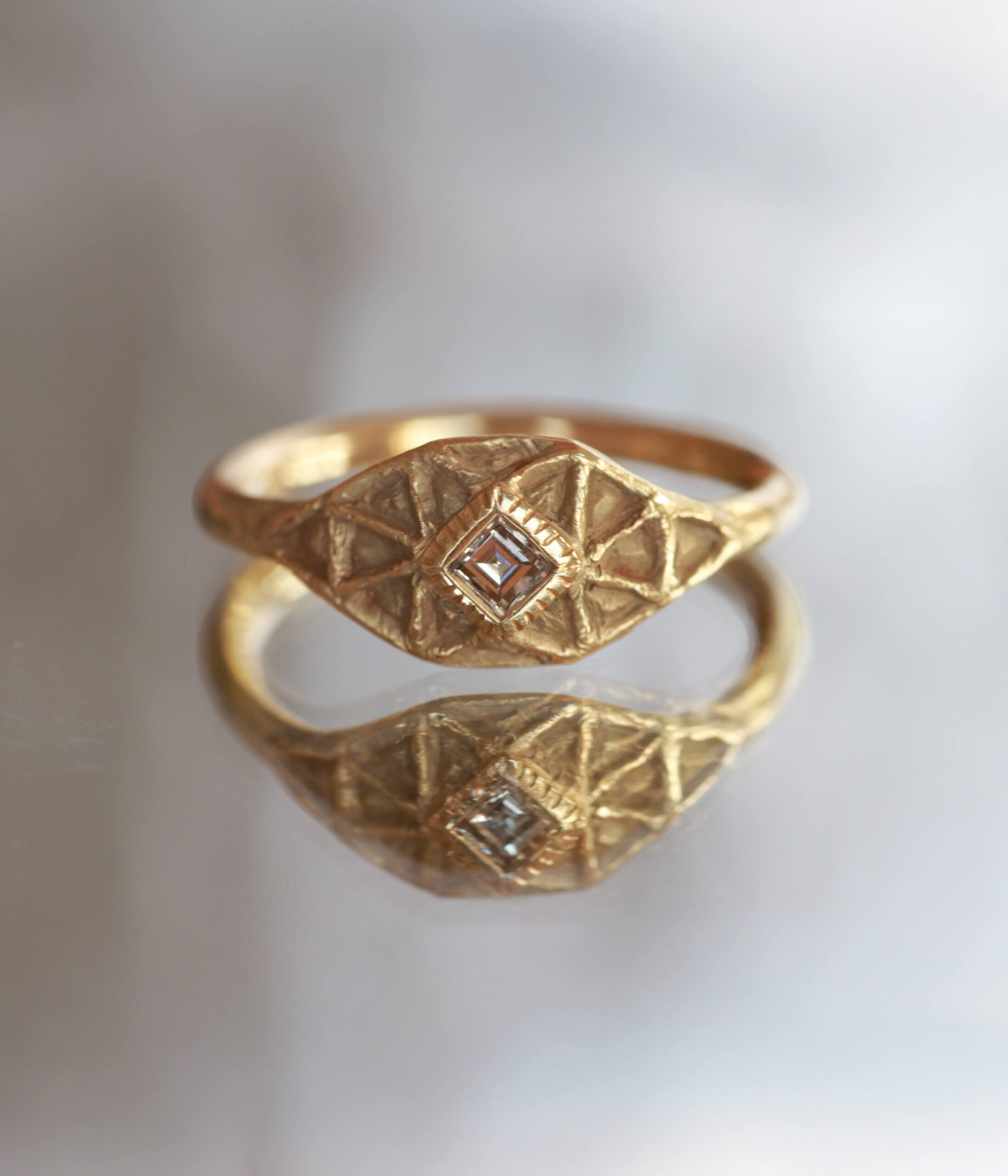 טבעת זהב 14K בעיצוב גיאומטרי עם טקסטורת משולשים עדינה היוצרת משחק אור ומראה ייחודי.