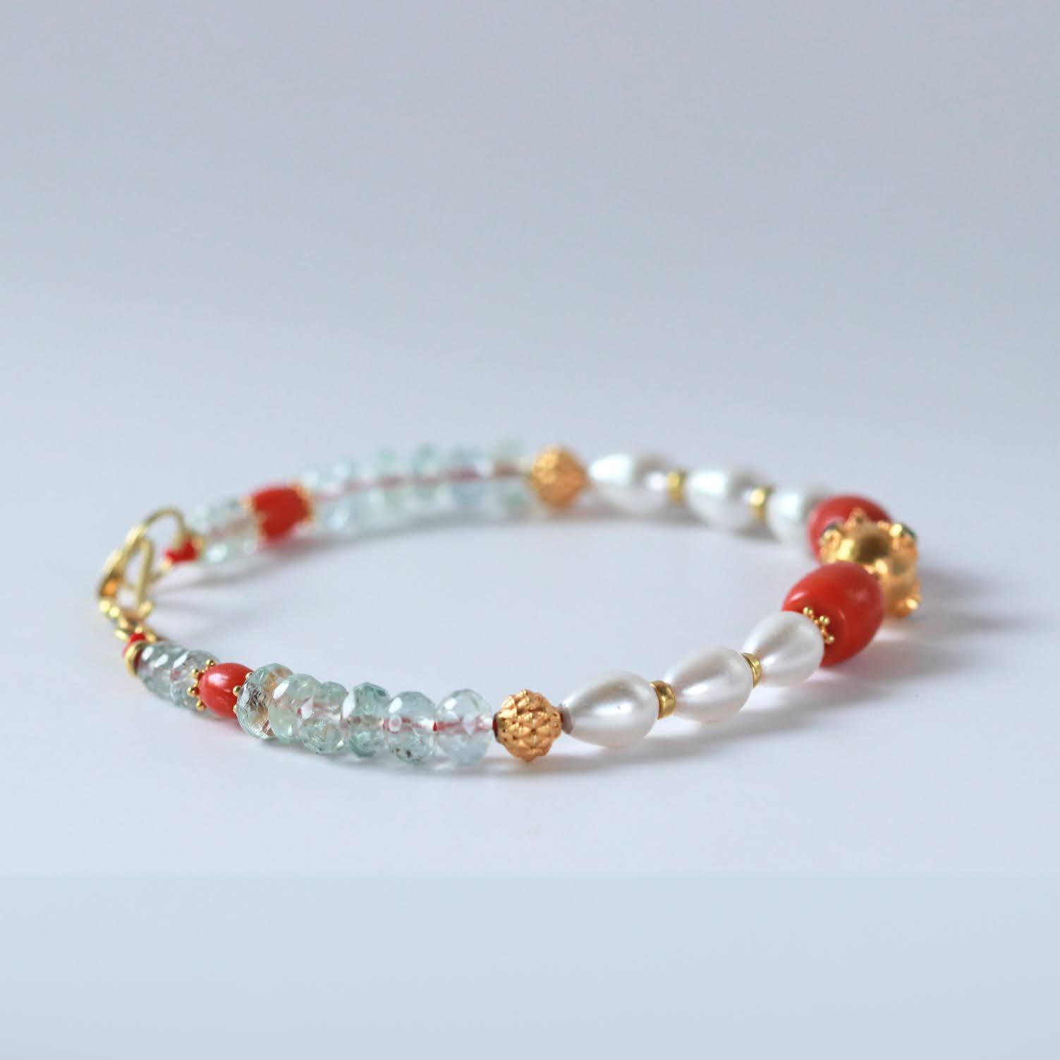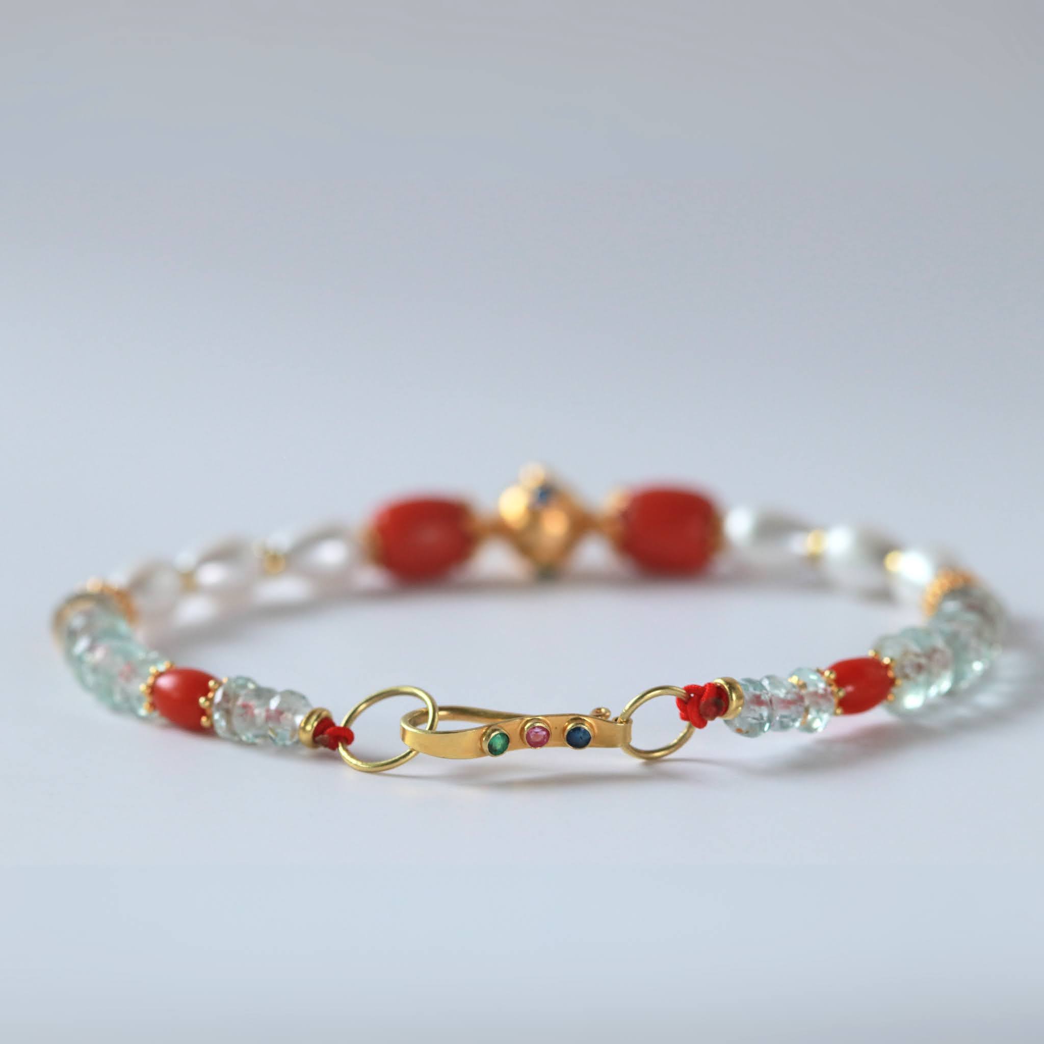 לצידן שזוריםנקוראלים איטלקיים נדירים מסרדיניה, אקוומרין באיכות גבוהה ושלל חרוזי זהב 18K