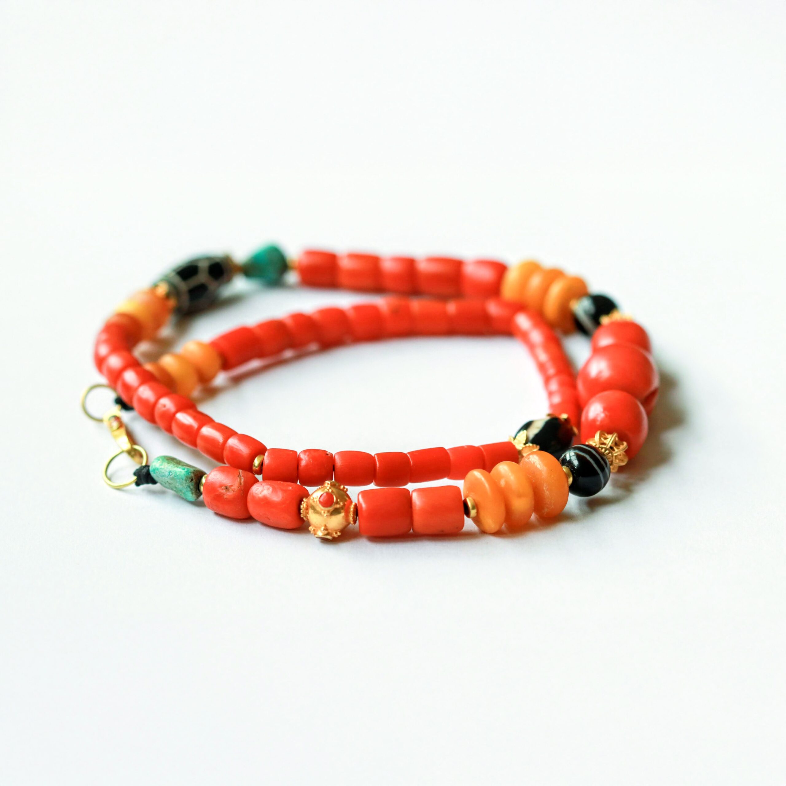 שילוב הטוּרקִיז העתיק עם הקוֹרָאלים האדומים, הענברים החמים והאגטים השחורים יוצר מָאלה שהיא מראה אותנטי ויוקרתי כאחד.