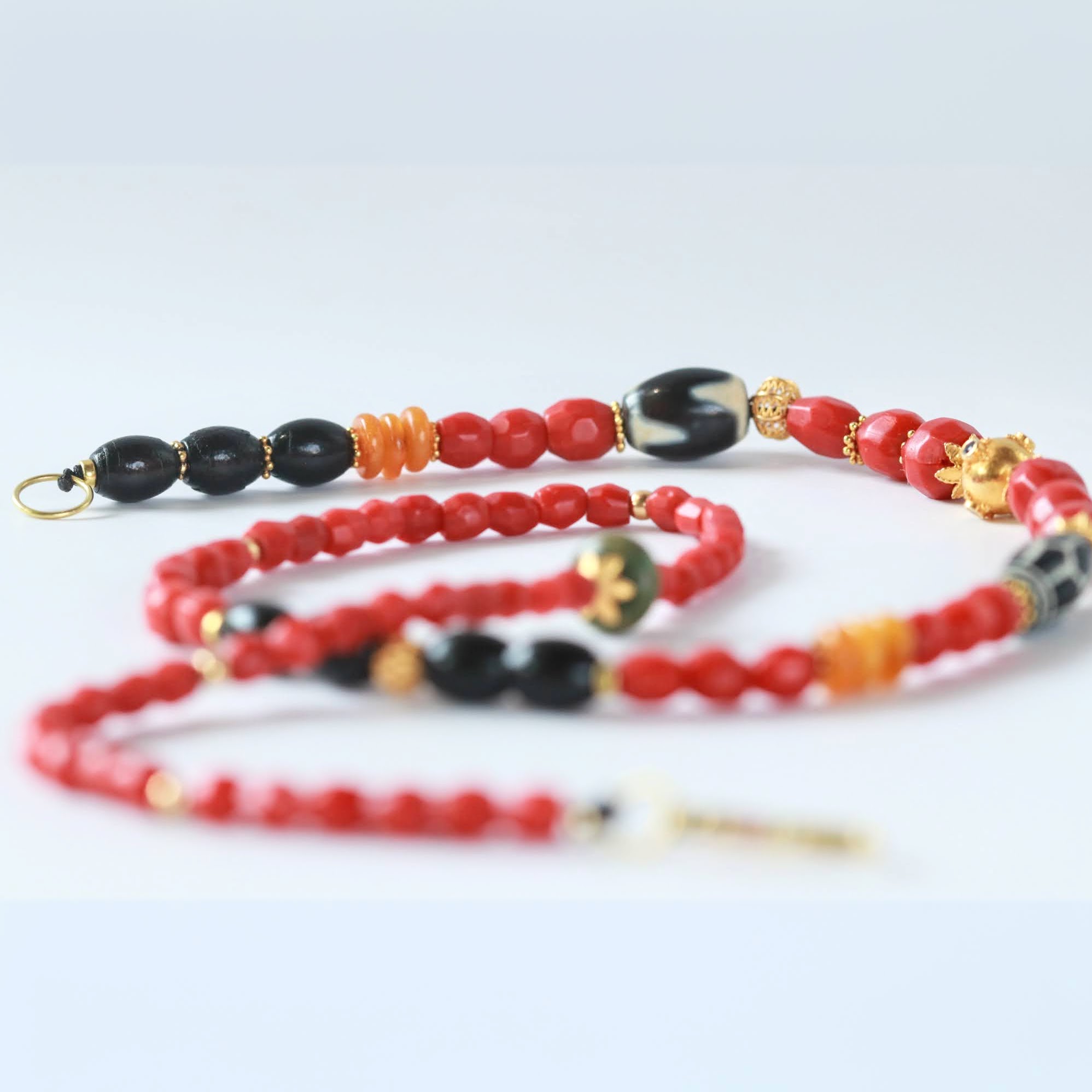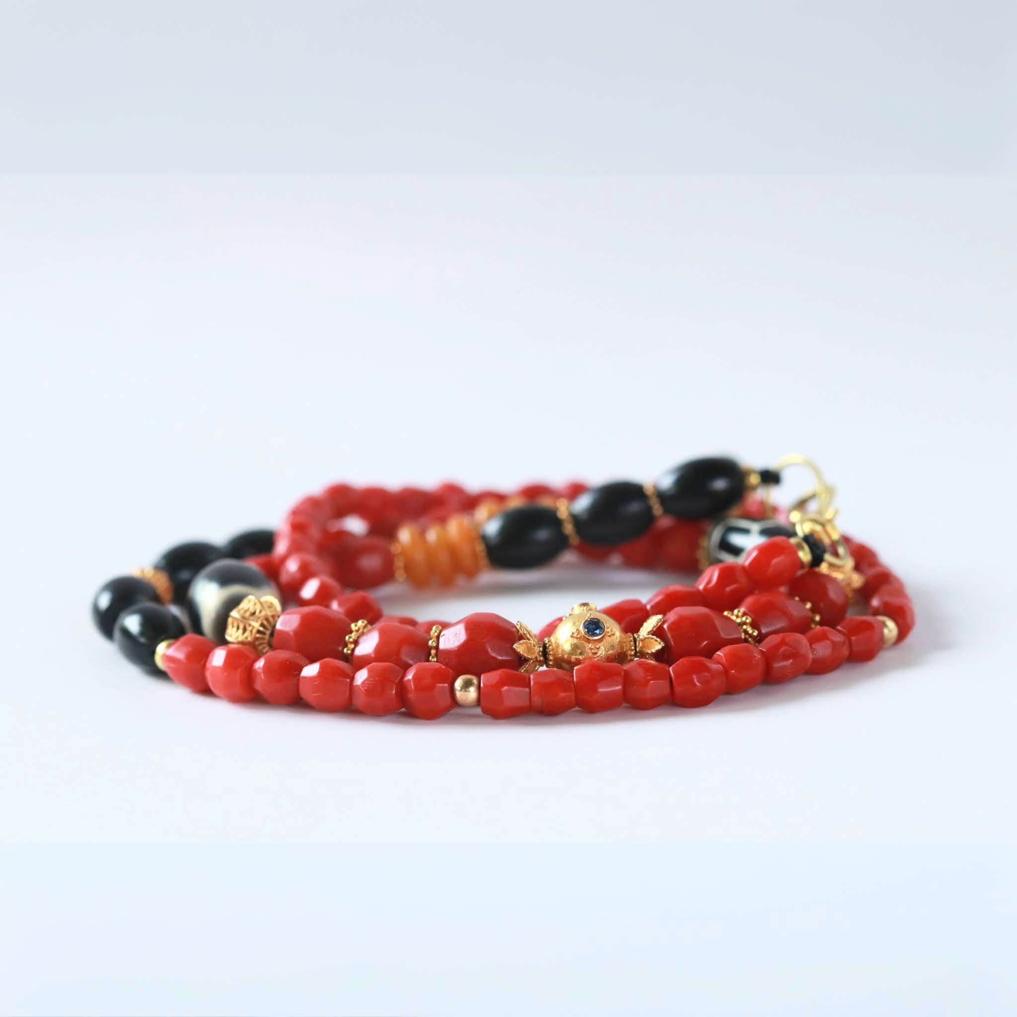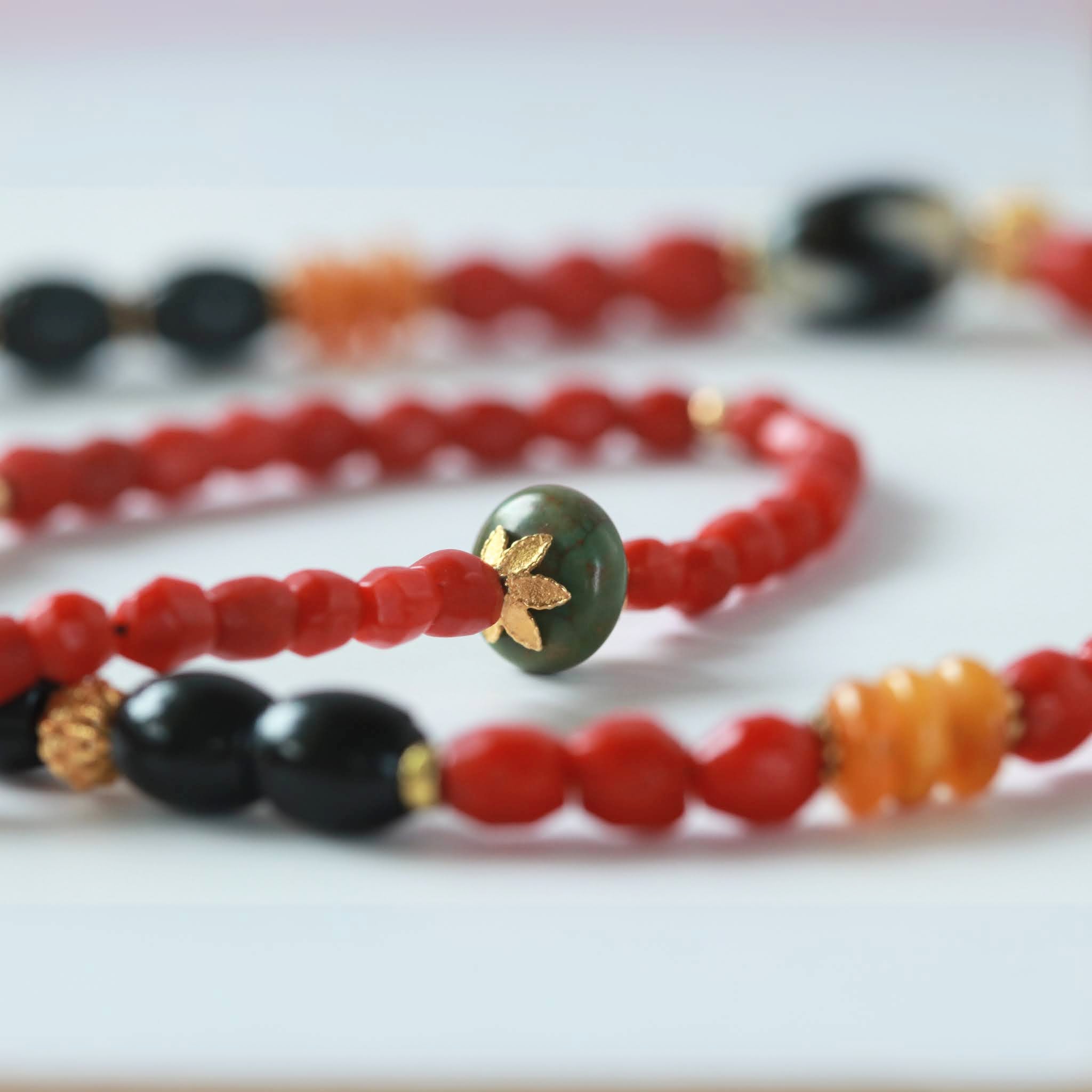 המָאלה הזו נושאת אופי עדין ורך, עם שילוב ייחודי של קוראלים אדומים ושחורים,ענברים וחרוזי זהב בעבודת יד מוקפדת. במרכז תלוי חרוז כדורי מזהב המשובץ בשתי אבני אמרלד ושתי אבני ספיר, ולצידו שתי אבני אגת מקושטות המעוטרות בתהליך טיבטי מסורתי. נגיעה עדינה של טוּרקִיז מאריזונה המוסיפה חכמה עתיקה ואיזון, והכול משתלב להרמוניה אלגנטית ונדירה.