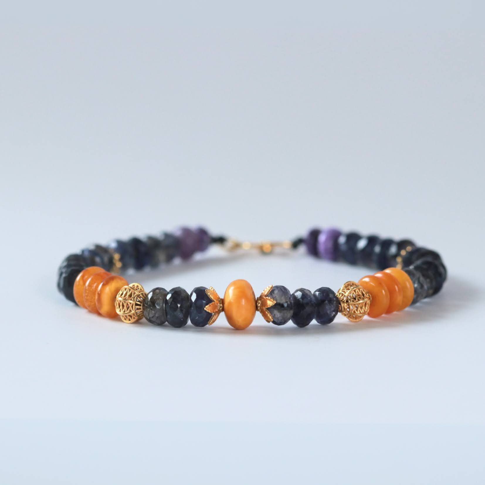הצמיד הזה משלב בין שלוש אבנים נדירות וייחודיות: לולאייט (Cordierite) – אבן שקופה בגוונים סגלגלים־כחלחלים, ענברים עתיקים וצ'רואייט סגולה, בעלת נוכחות עוצמתית ותנועה פנימית מרהיבה. אליהן מצטרפים חרוזי זהב 18 קראט, וסוגר משובץ באמרלד יקרה.
