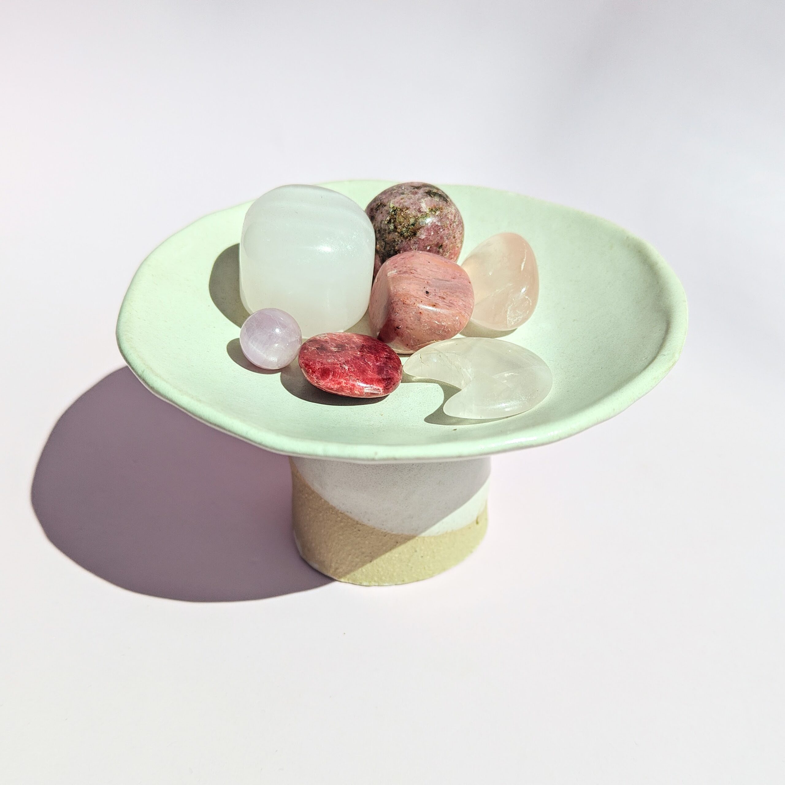 בחרנו ליצור קערת קרמיקה מיוחדת – בעבודת יד ישראלית, עדינה ומעוצבת – ומלאנו אותה באוסף של אבנים ורודות עוצמתיות. כל אחת מהן נושאת אנרגיה ייחודית שתומכת בלב שלך, מעניקה ריפוי, אהבה ואיזון פנימי.