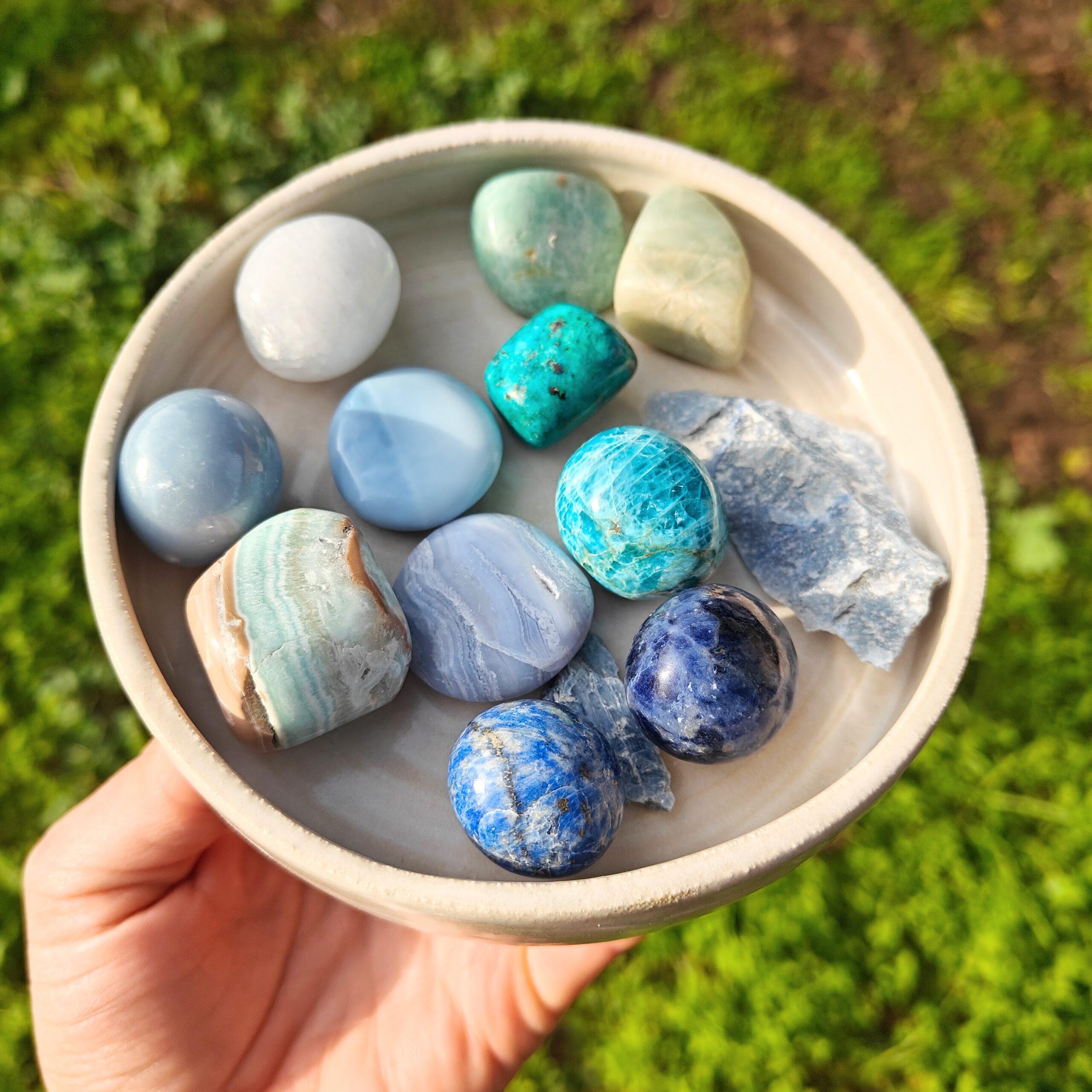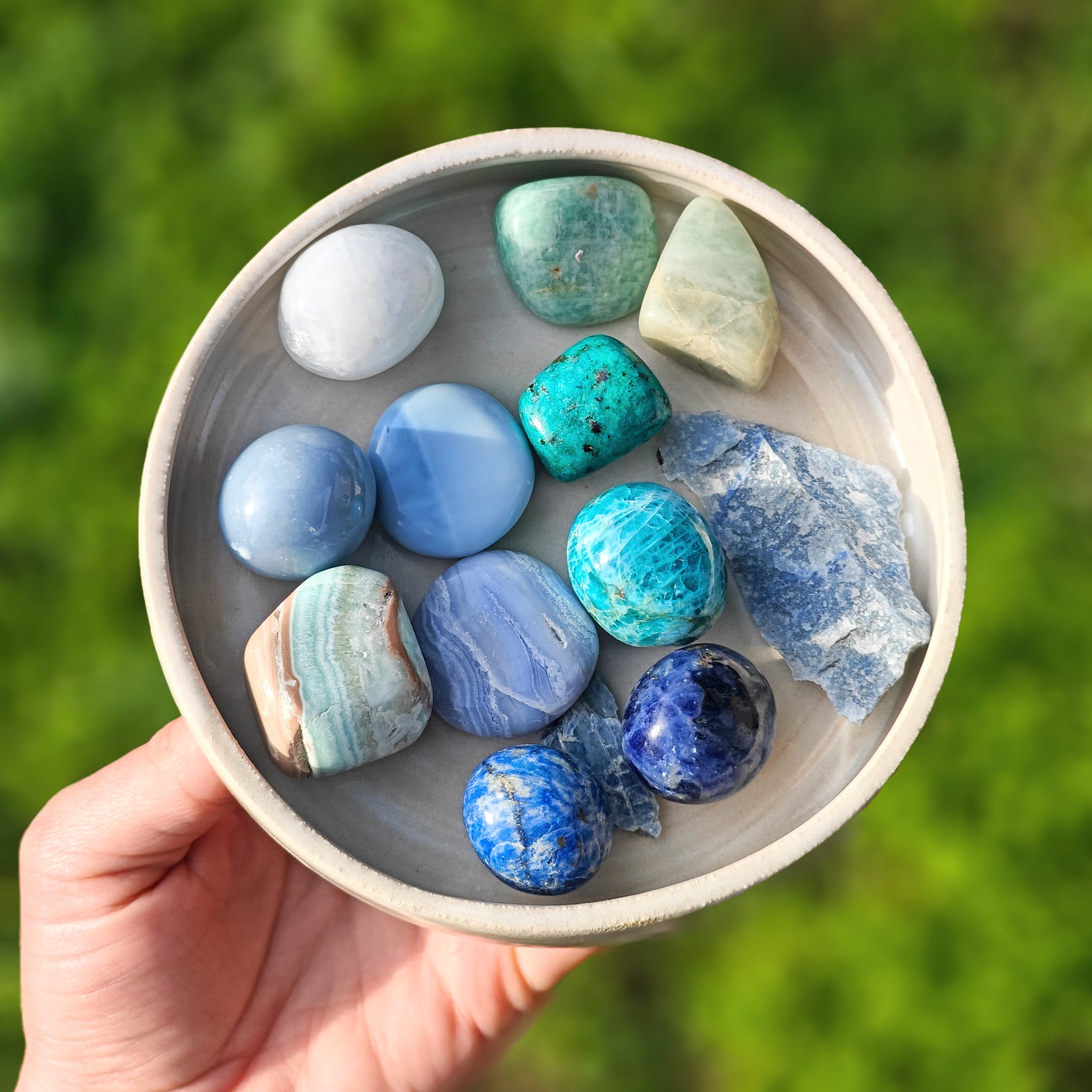 בחרנו ליצור קערת קרמיקה ייחודית ומלאנו אותה באוסף של אבנים בגוונים כחולים עדינים שמחברים אותך לאנרגיית צ'אקרת הגרון שלך.