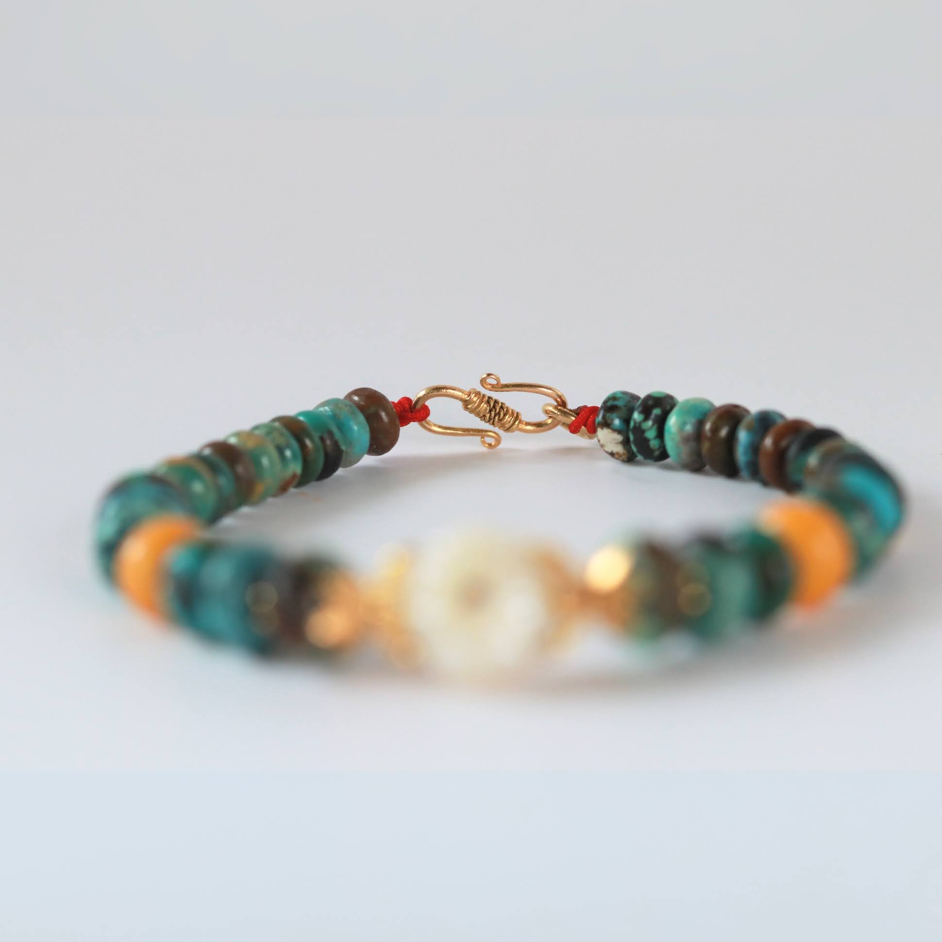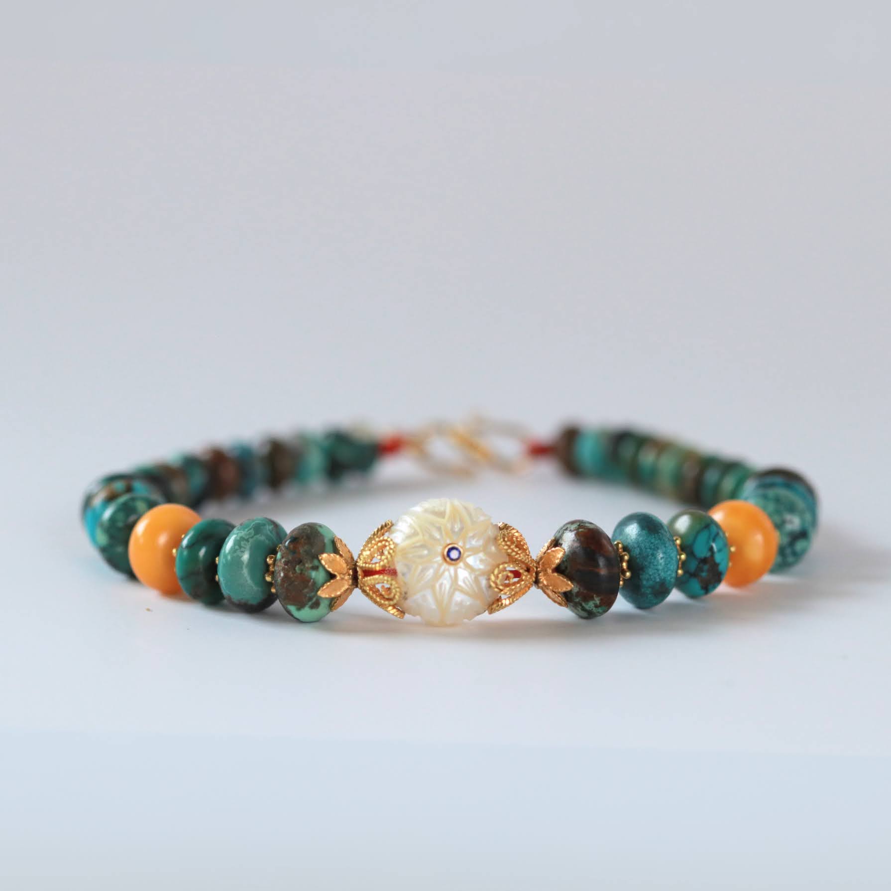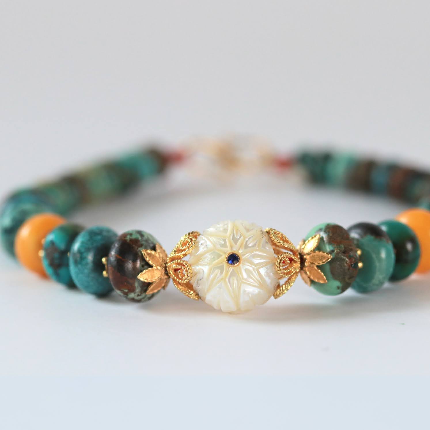 אליה מצטרפים ענברים עתיקים בעלי גוון זהוב חמים, טורקיזים מאריזונה עם תדר של חכמה ואמת פנימית, וחרוזי זהב 18 קראט.
